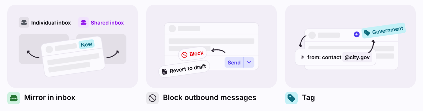 Example: When an email arrives in a Customer Success Manager’s individual (personal) inbox, mirror the conversation in the “Customer Success” shared inbox. All Customer Success Managers can view the conversation and jump in and respond when their teammate is out of office.