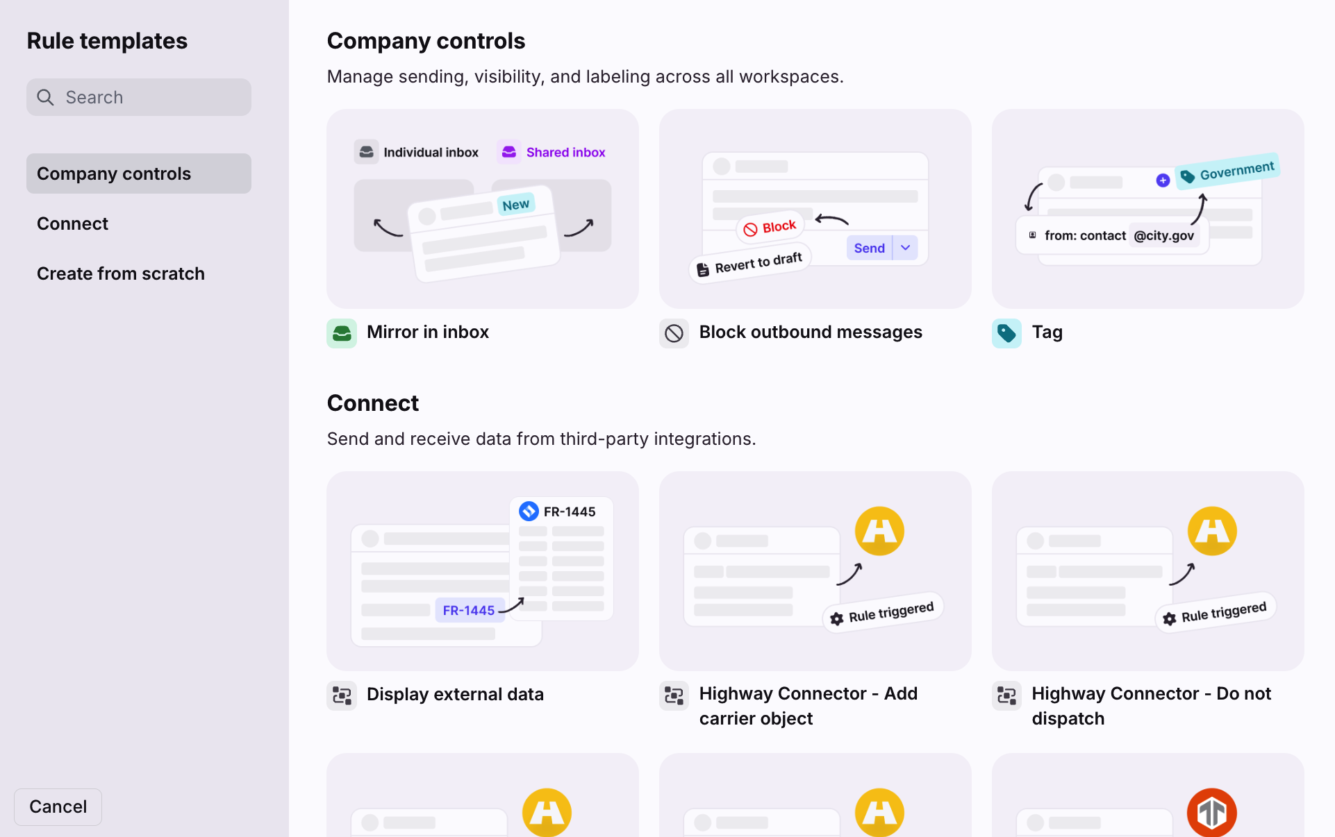 Use Front’s company rule library to quickly explore and set up automations that apply to both individual and shared inboxes across your entire organization. Leverage company rules to ensure consistent implementation across all workspaces.