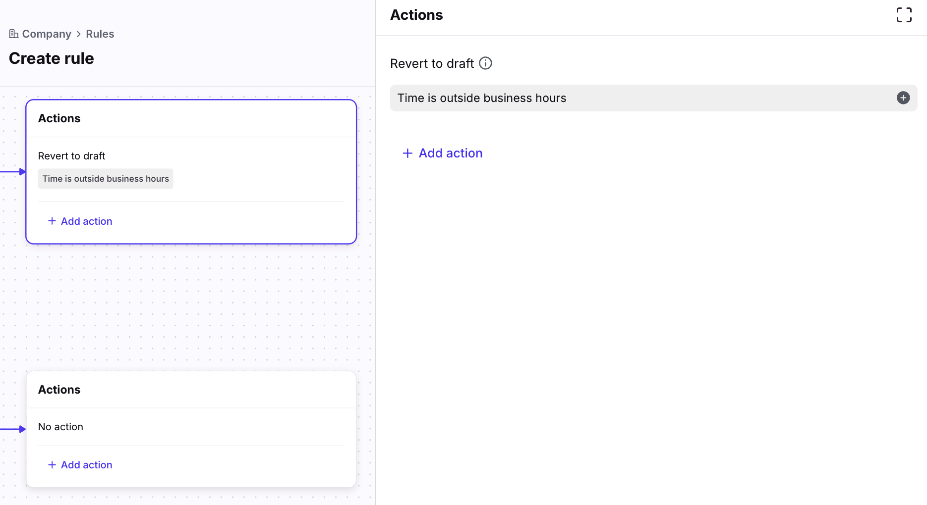 In the Actions steps, add the actions you want the rule to take depending on the branch. In the Revert to draft action, enter the error message text you want teammates to see if the rule applies to their message. Add any additional actions as needed.