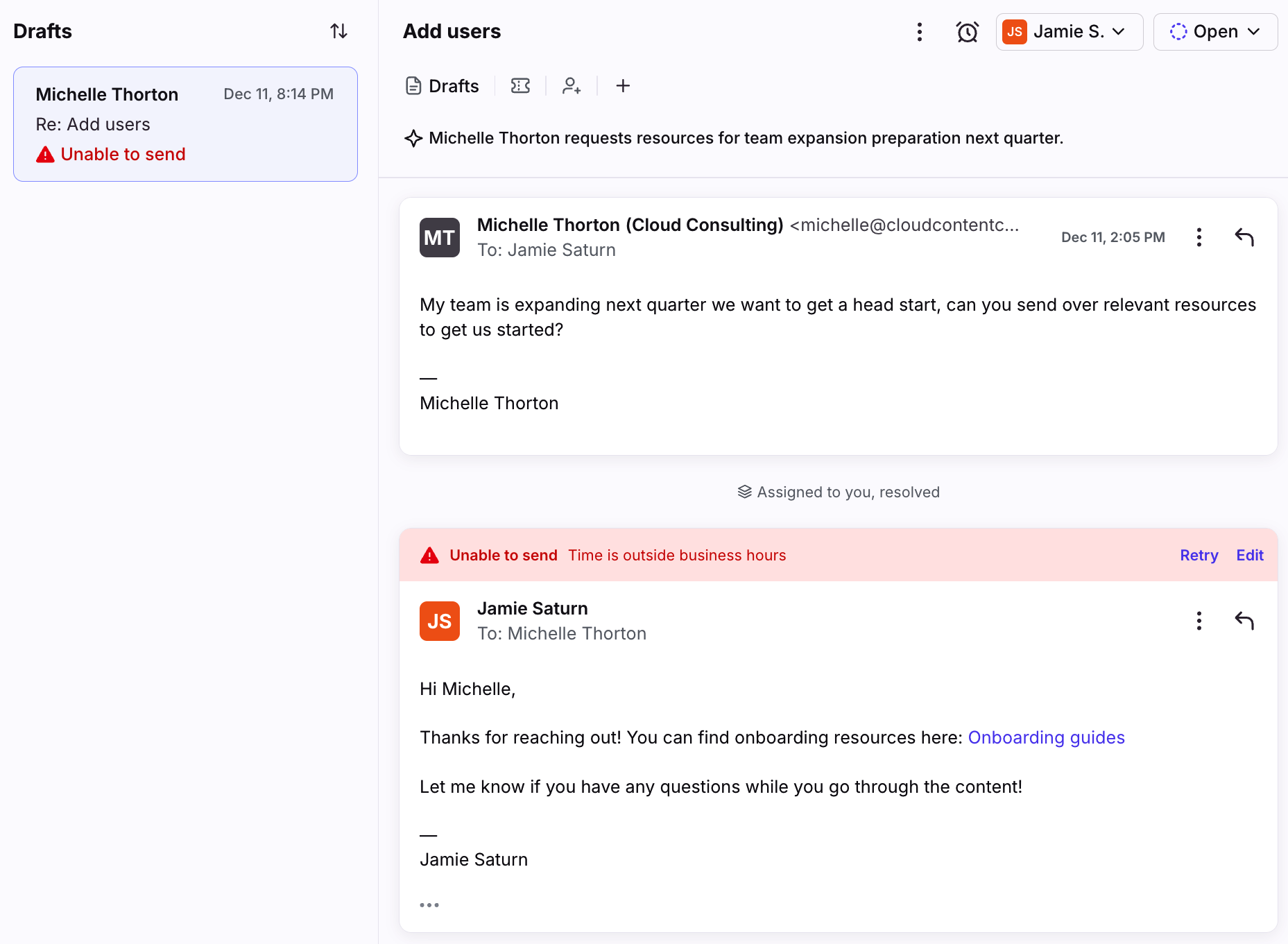 Teammates will see a banner above the draft with the error message, along with Retry and Edit options.