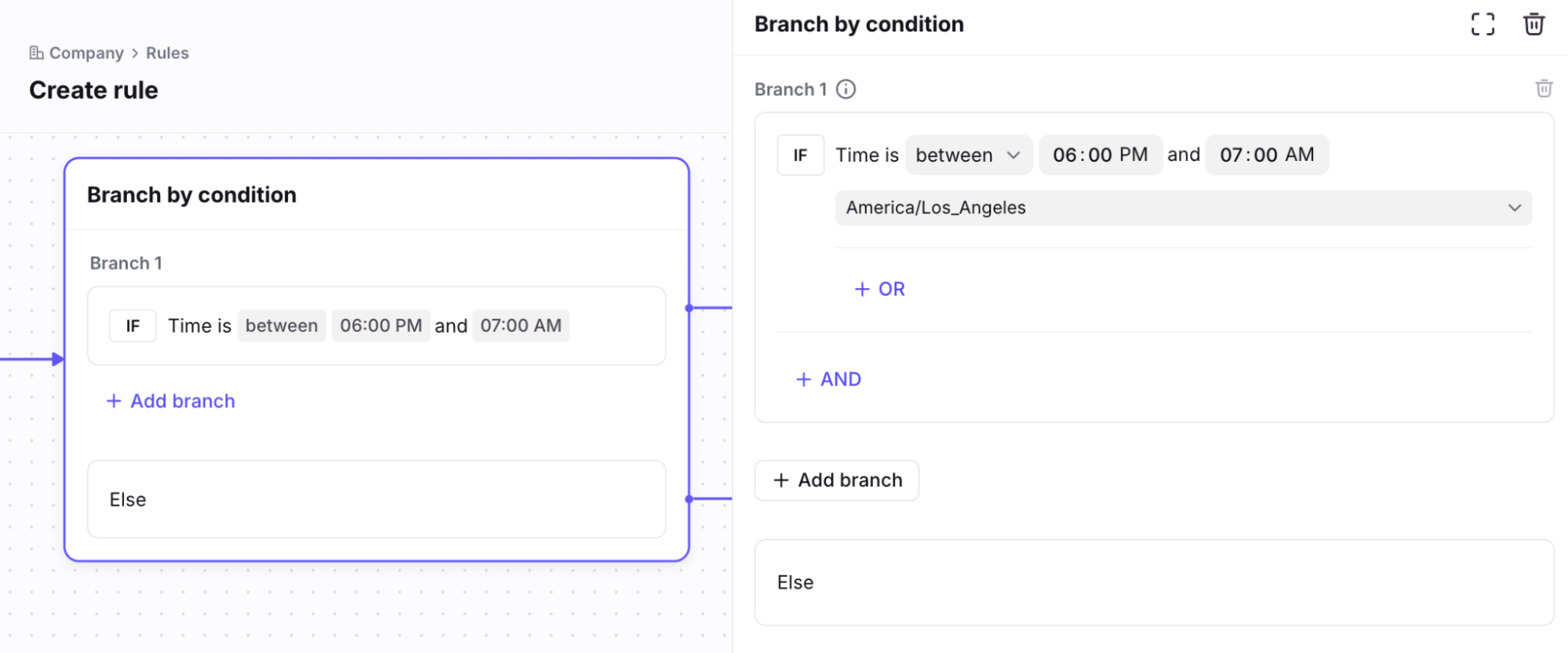 In the Branch by condition step, adjust the conditions to narrow down when the rule should run.