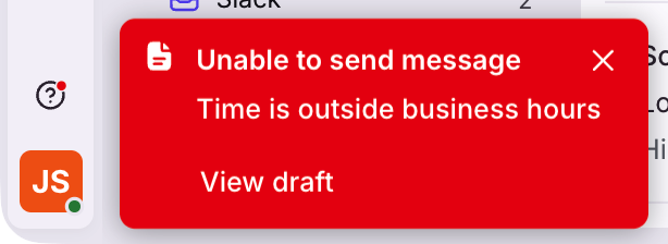 In this example rule, we want teammates to see the error “Time is outside business hours” when they try to send a message.
