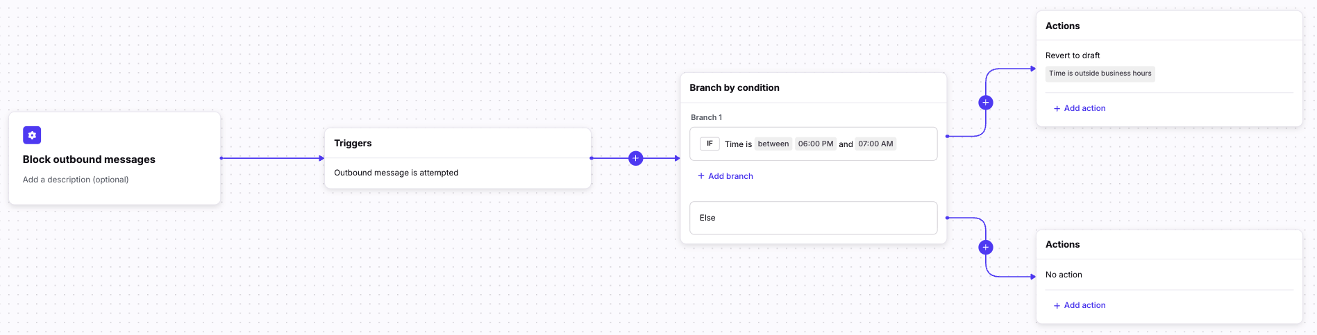 In this example rule, we want to prevent teammates from sending outbound messages outside of business hours.