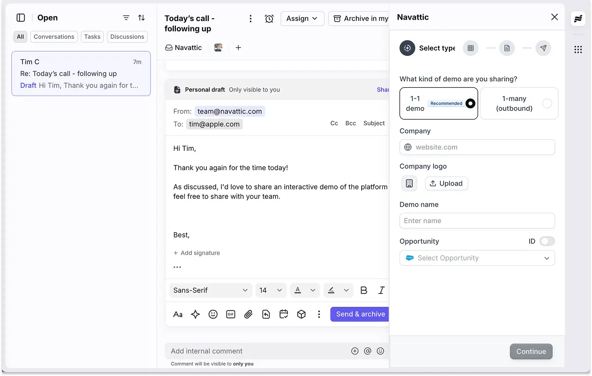 The integration with Front centralizes demo content within Front, streamlining access across the entire go-to-market team. Front team members can use personalized Navattic interactive demos for specific recipients or general outbound outreach, and they receive activity and tracking analytics to monitor engagement. This consolidated approach empowers the go-to-market team with the tools and insights needed to drive higher demo engagement and conversion.
