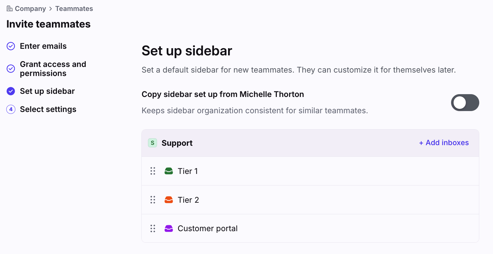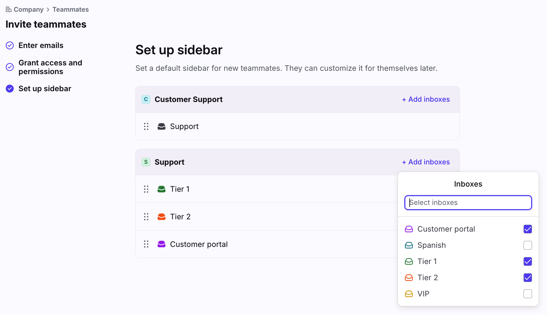 Click Add inboxes to choose which inboxes will be shown in the user's left sidebar. This allows your new teammates to see the inboxes they'll be working with when they first log in. Click and drag the six-dot menu to re-order the inboxes. Your new teammate can customize this later.