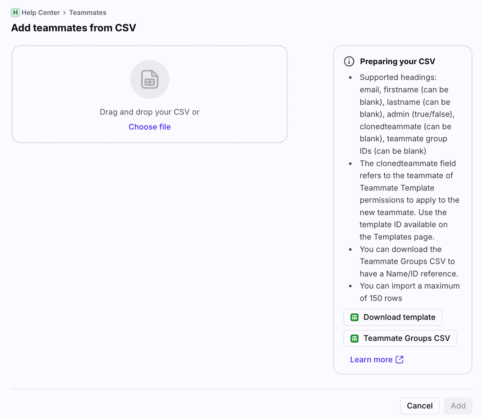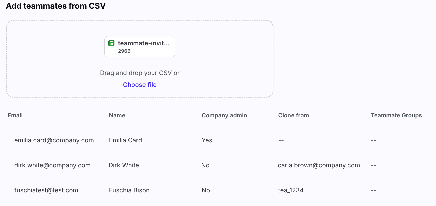 Click Choose file or drag and drop your file from your computer into this section. You can invite up to 150 teammates at once using this method.