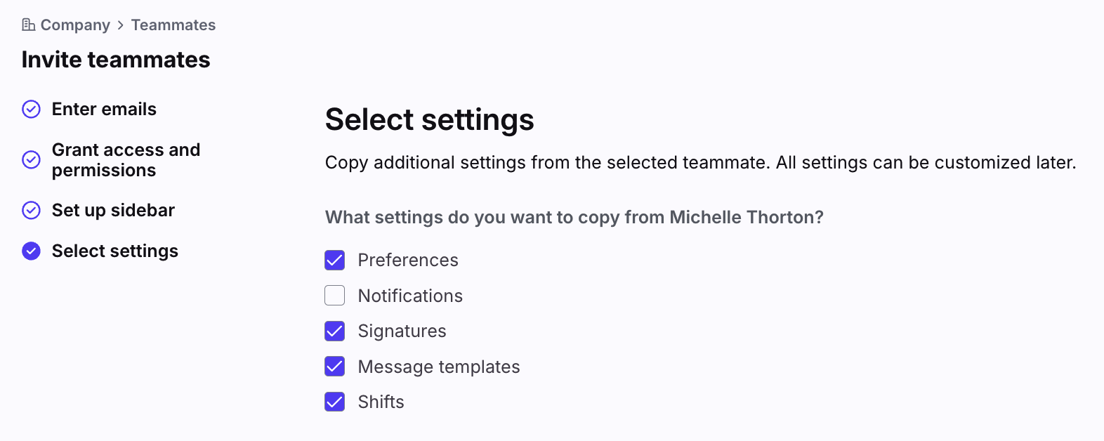 If you choose to copy settings from a teammate when inviting new users, the selected settings and resources will be inherited by the newly invited teammate to give them a head start on setup. This is helpful for configuring a large number of users who have the same or similar preferences.