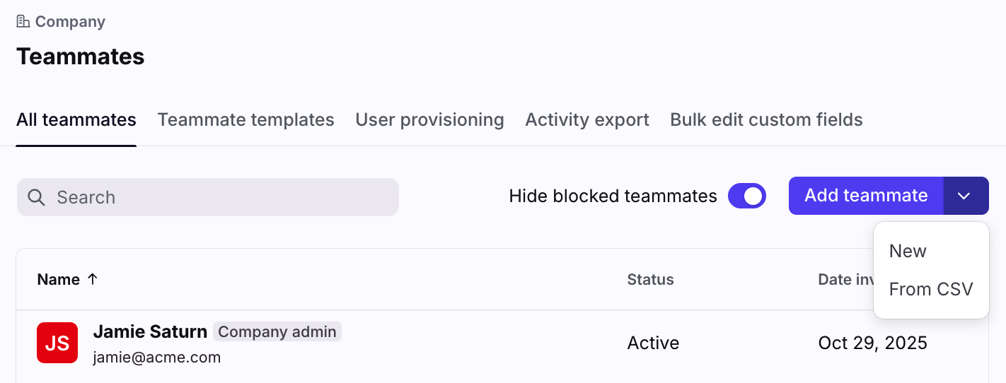 Click the gear icon and navigate to your company settings. Select Teammates in the sidebar.