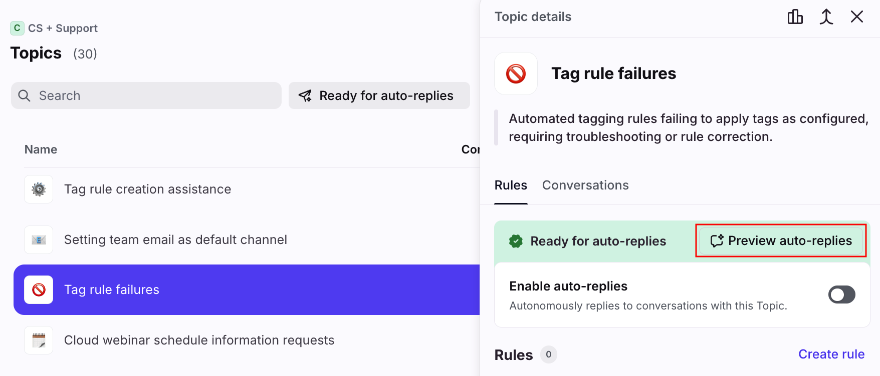 Select the Topic you’d like to manage, then click Preview auto-replies.