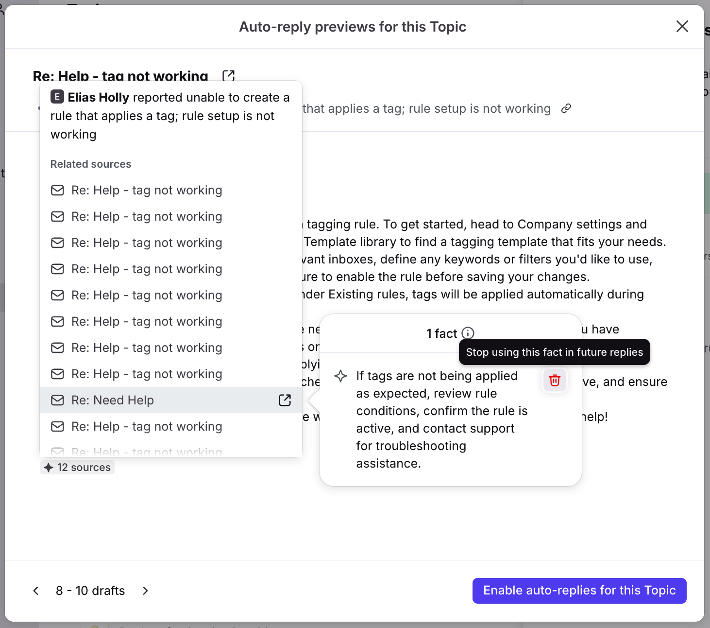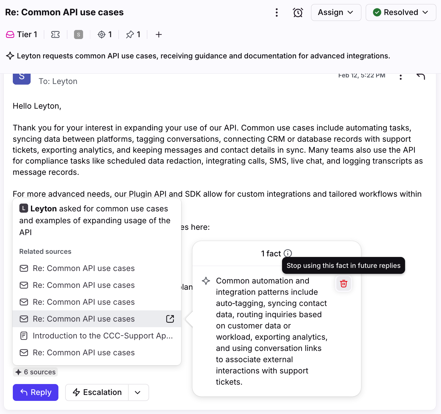 In the pop-up, hover over the # sources indicator. Hover over a similar conversation (indicated with an envelope icon) to view relevant facts used to inform AI-generated responses.