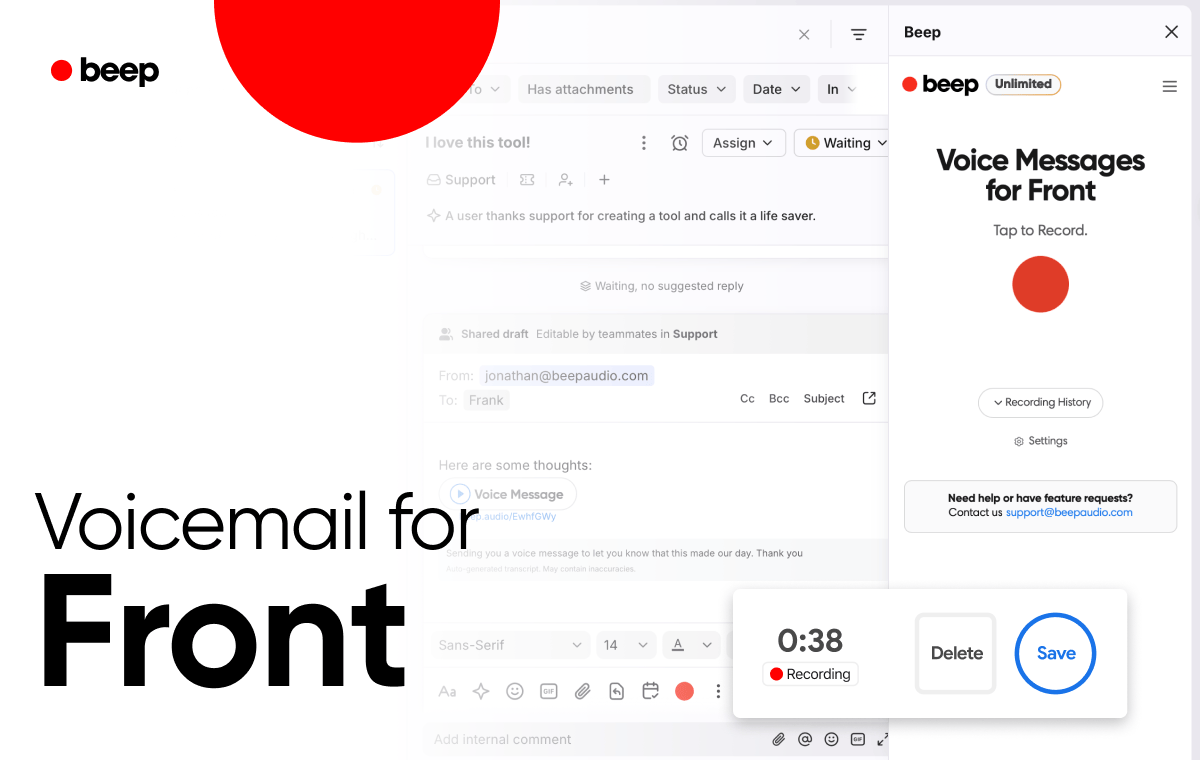 Beep embeds directly into Front’s composer and sidebar, allowing teams to record voice messages (with transcripts) inside conversations and internal comments. With one click, users can seamlessly insert a recording and transcription into any message, making it easy to explain complex issues, coach teammates, or respond to customers more personally.