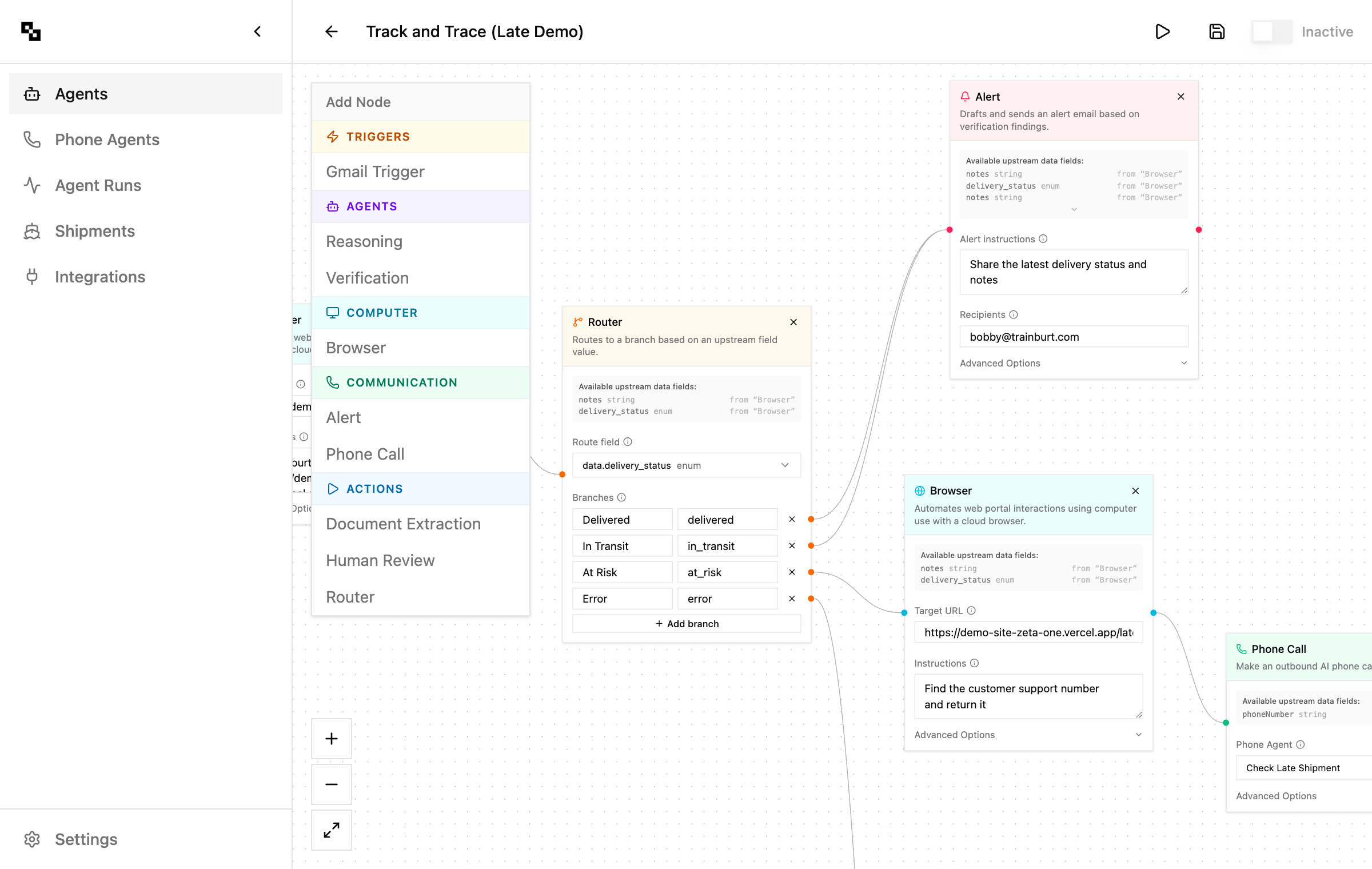 The Burt integration connects to your Front shared inboxes and reads incoming emails in real time. When relevant messages come in (tracking updates, document requests, quote inquiries), Burt ingests them and automatically triggers workflows with full context from those emails, allowing your team can skip the manual work.