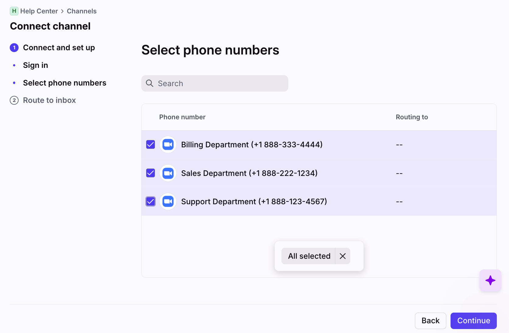 Click Continue to finish. All calls and messages from your channels will route to the selected inboxes by default.