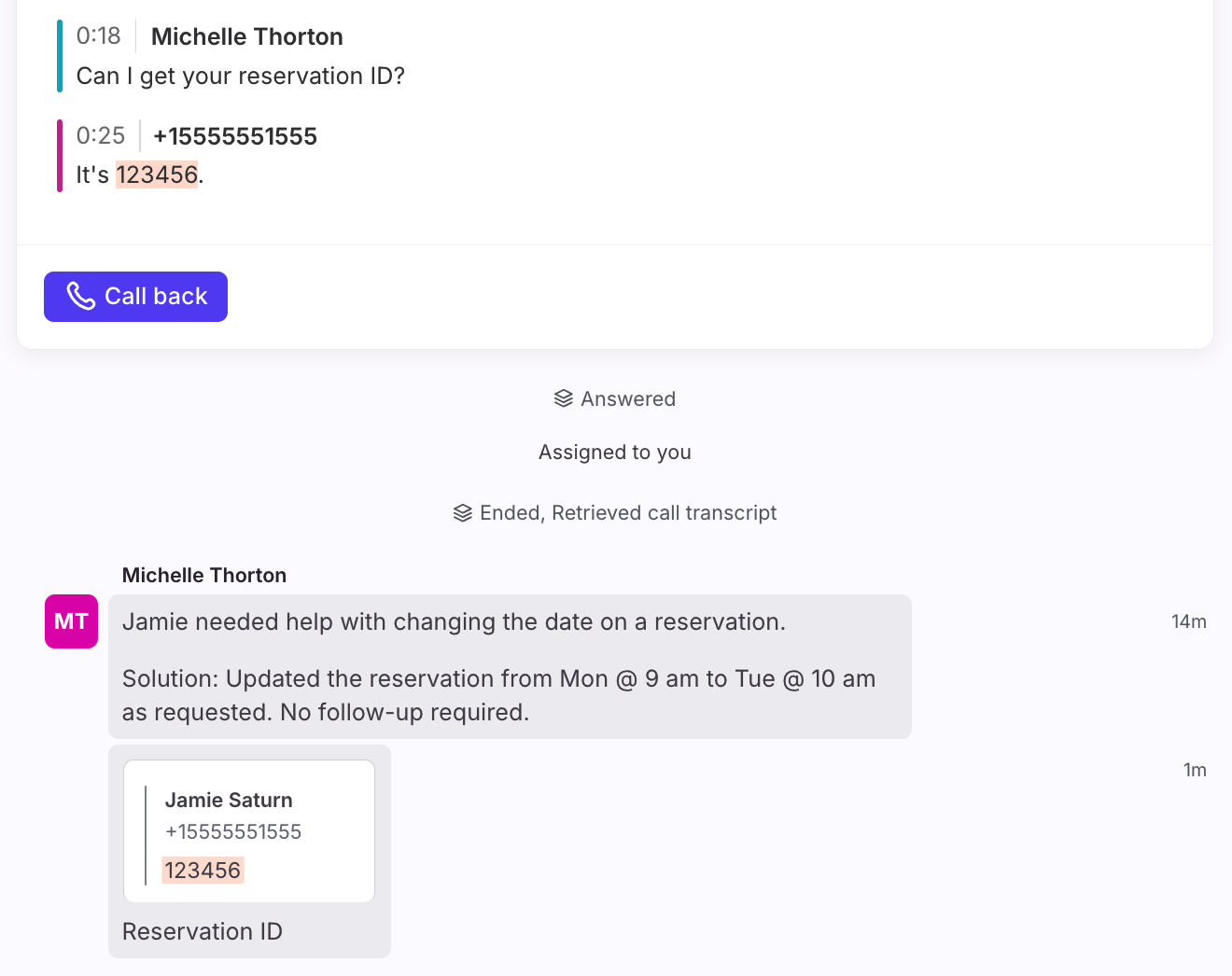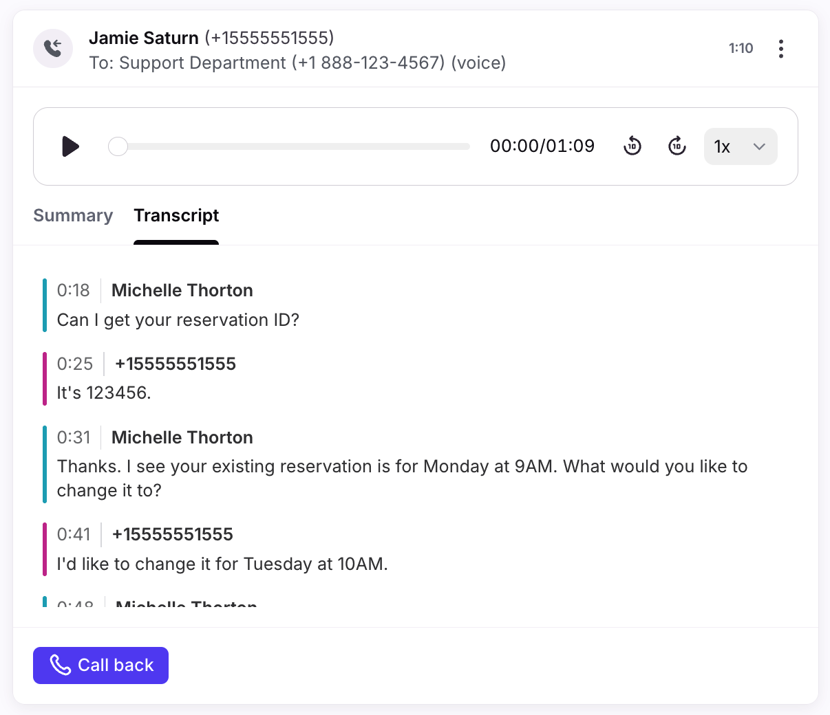 Call summaries, transcripts, and call recordings are available for applicable conversations.