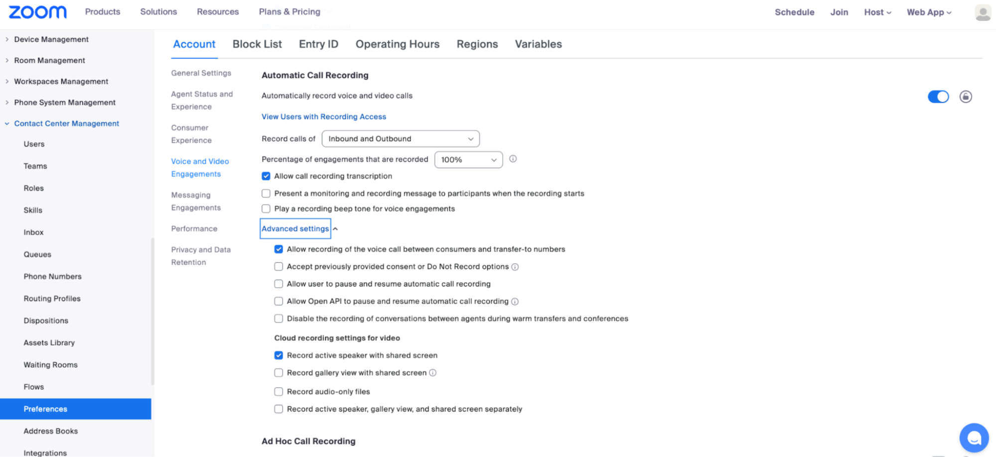Under Voice and Video Engagements, enable Automatic Call Recording.