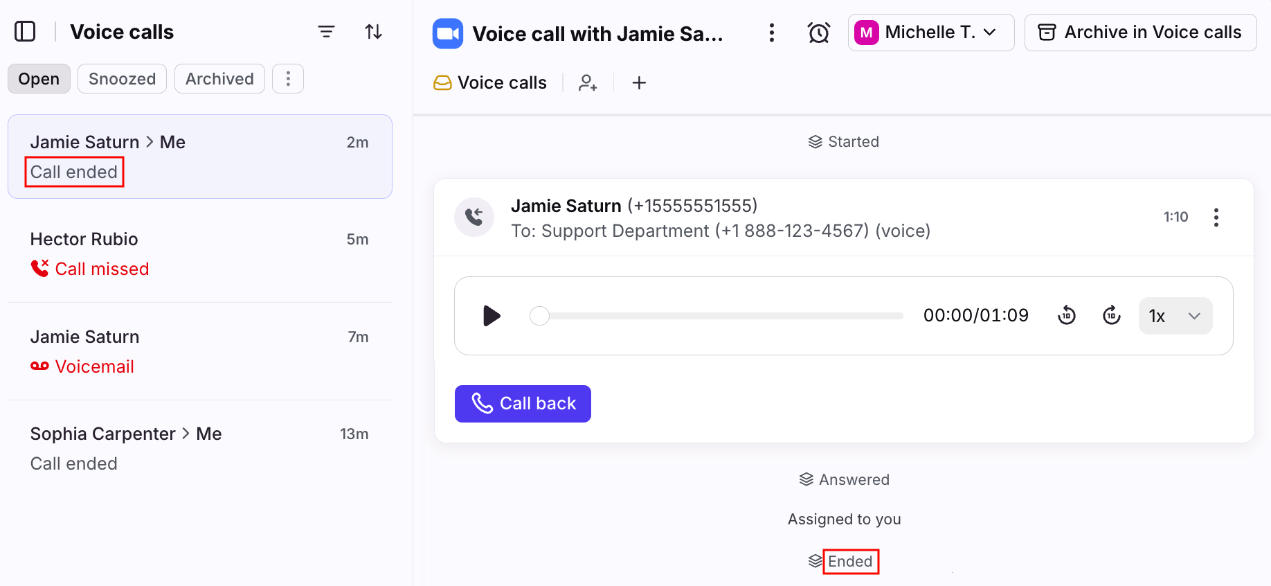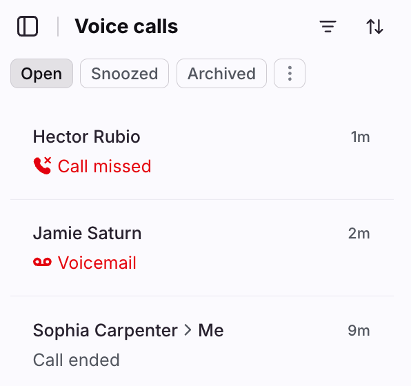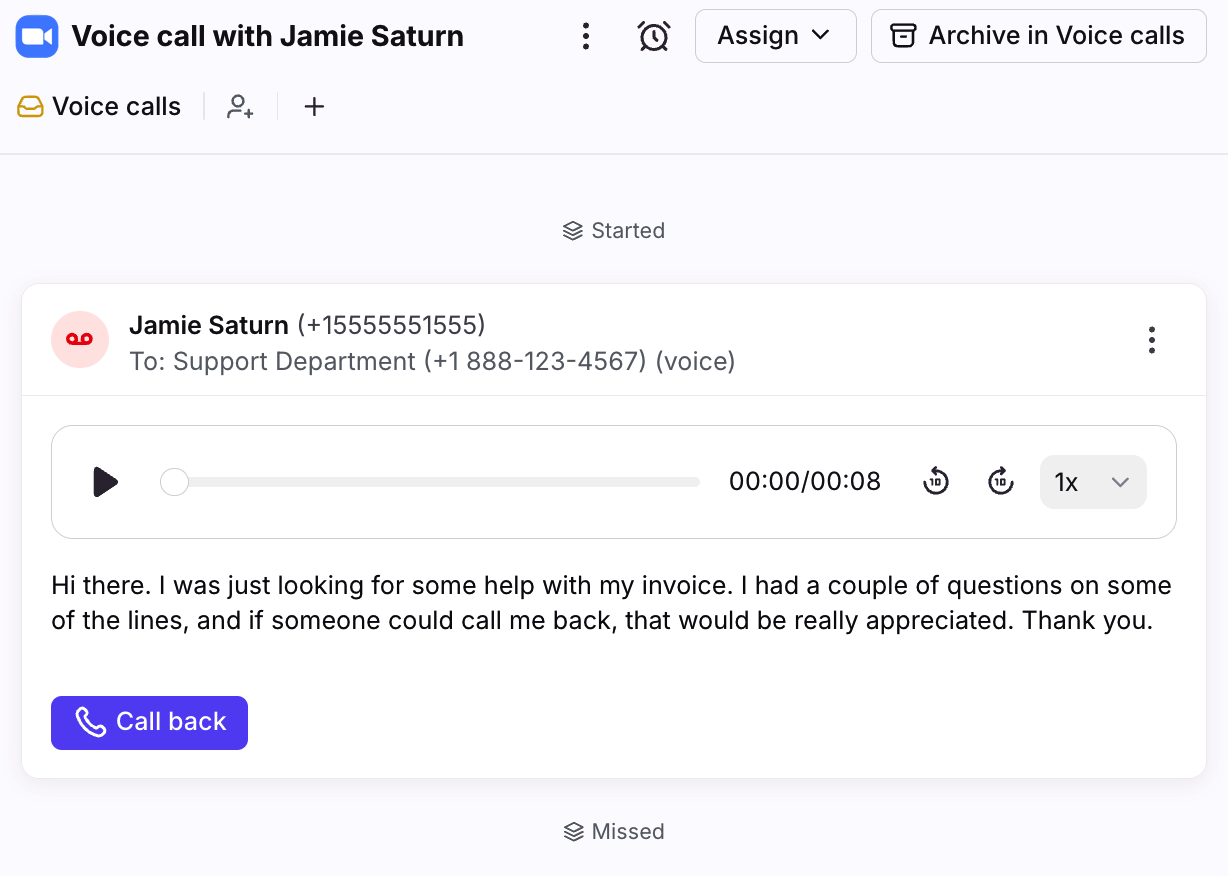 If no one is available to answer a call, a conversation will be created and marked as marked as Call missed or Voicemail in the conversation list.