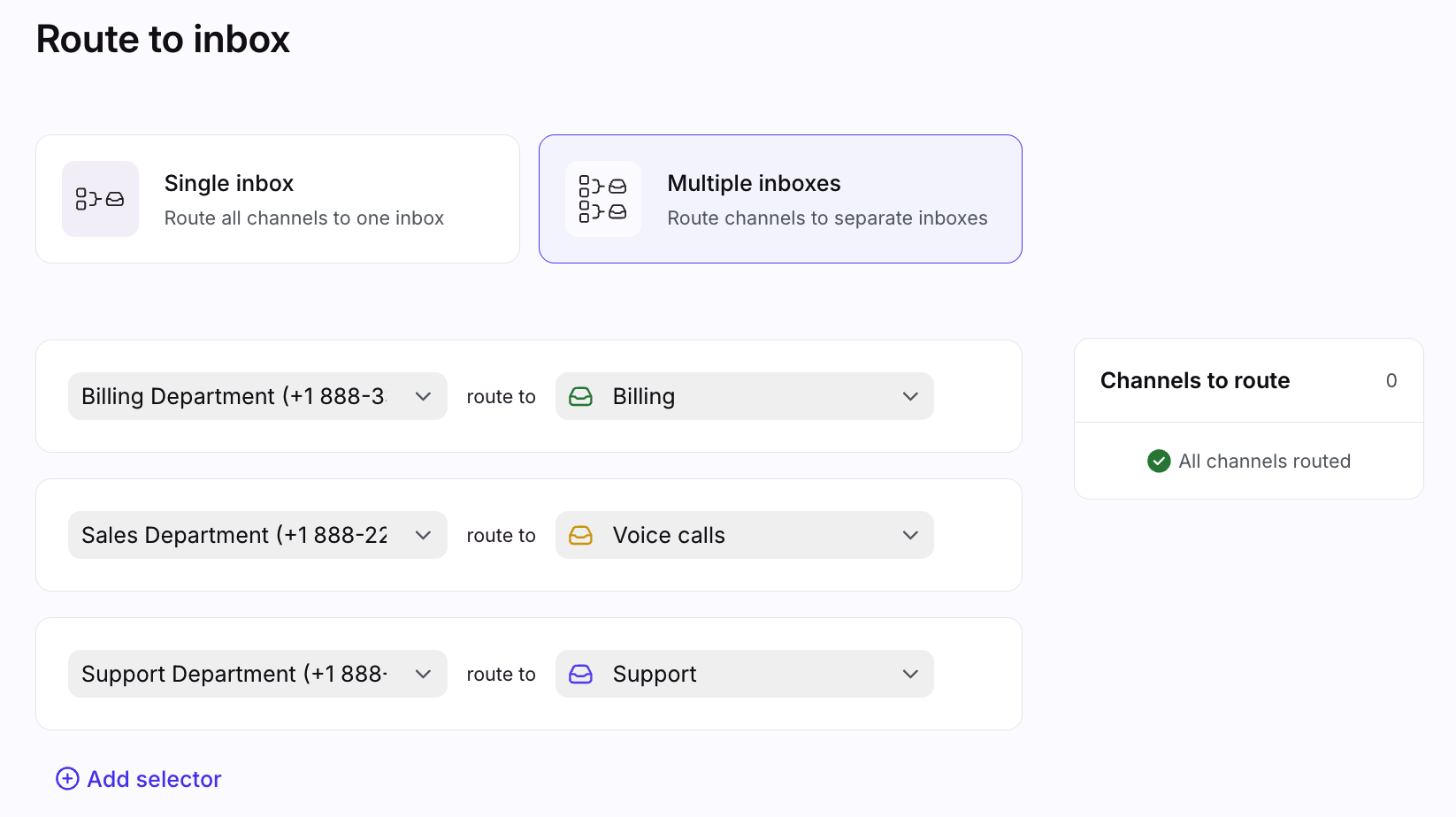 In the Route to inbox page, select whether you want to route the channel(s) to a single inbox, or multiple inboxes.