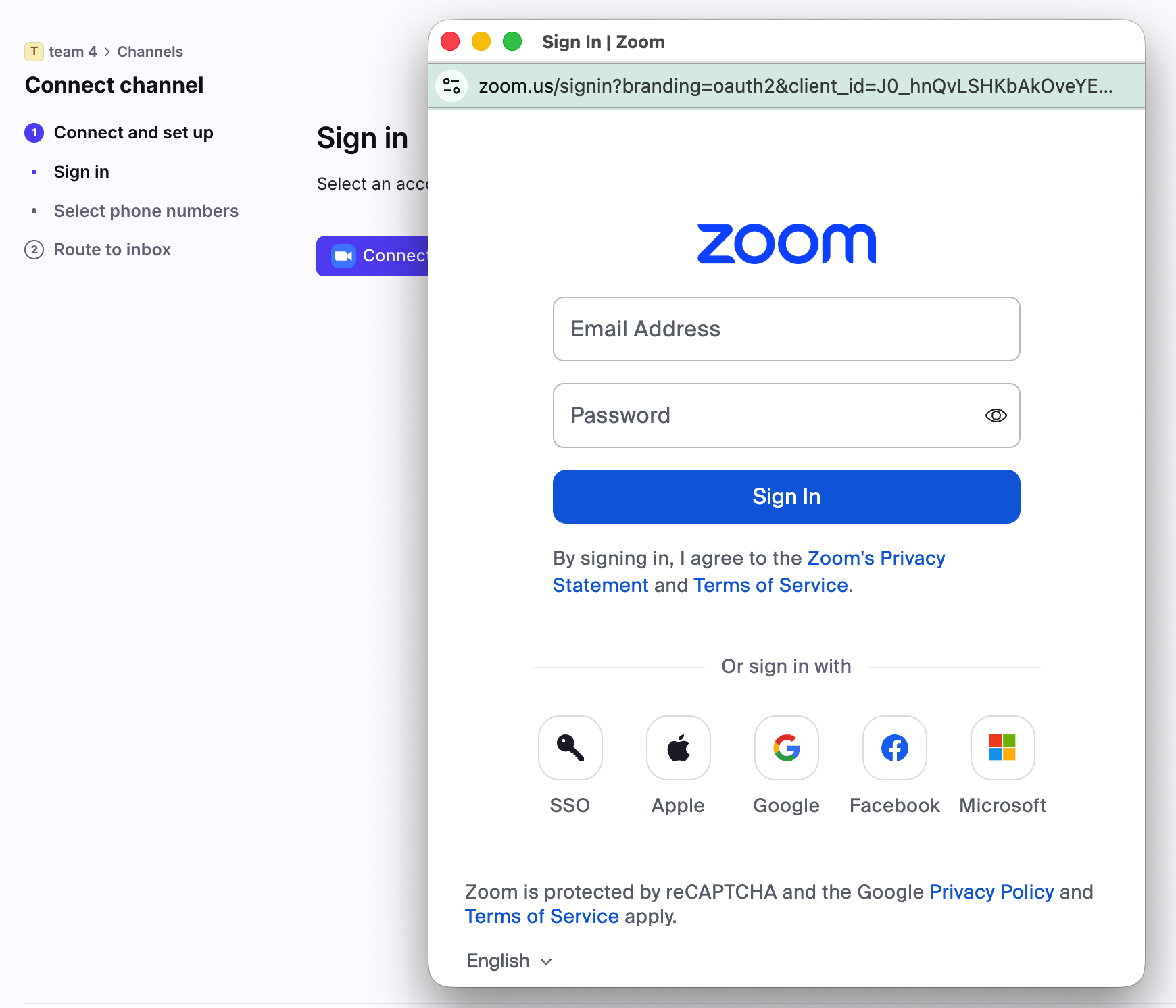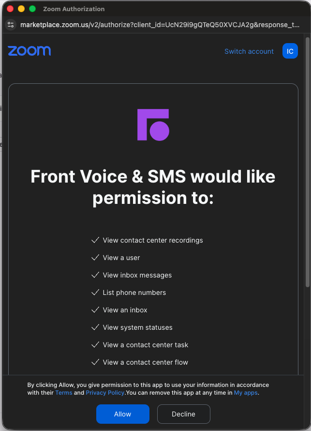 This is required for the Zoom voice call widget to work inside Front. You can skip this section if you’re only connecting SMS channels.