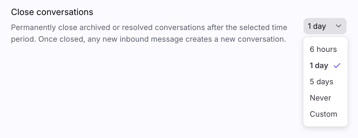 If you plan to use AI features with your inbox, we do not recommend selecting Never. See this article to learn how the Close conversations setting affects AI features.