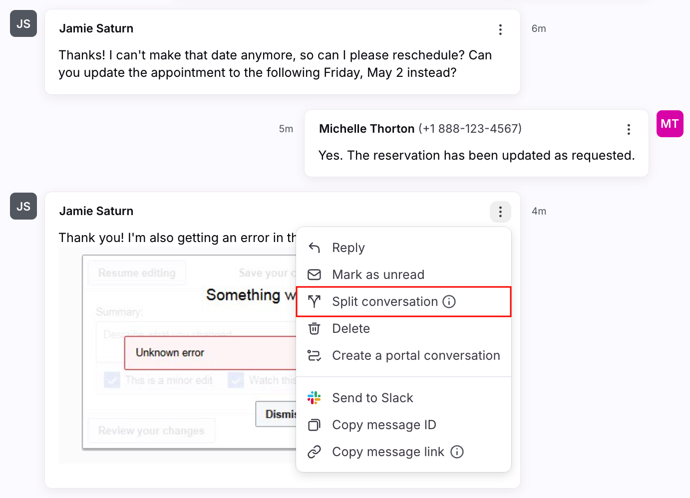 Messages from the same customer will thread together into the same conversation. To separate topics into new conversations, use the Split conversation feature in the message’s three-dot menu.