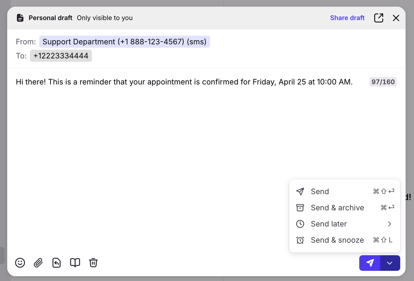 Enter your message in the composer and add emojis, attachments, message templates, or knowledge base article links as needed. Once finished, send the message using one of Front’s sending options.