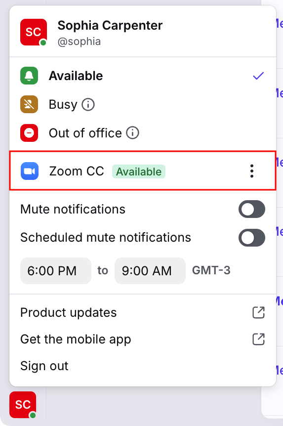 In Front, you can see your Zoom Contact Center status in your account menu.