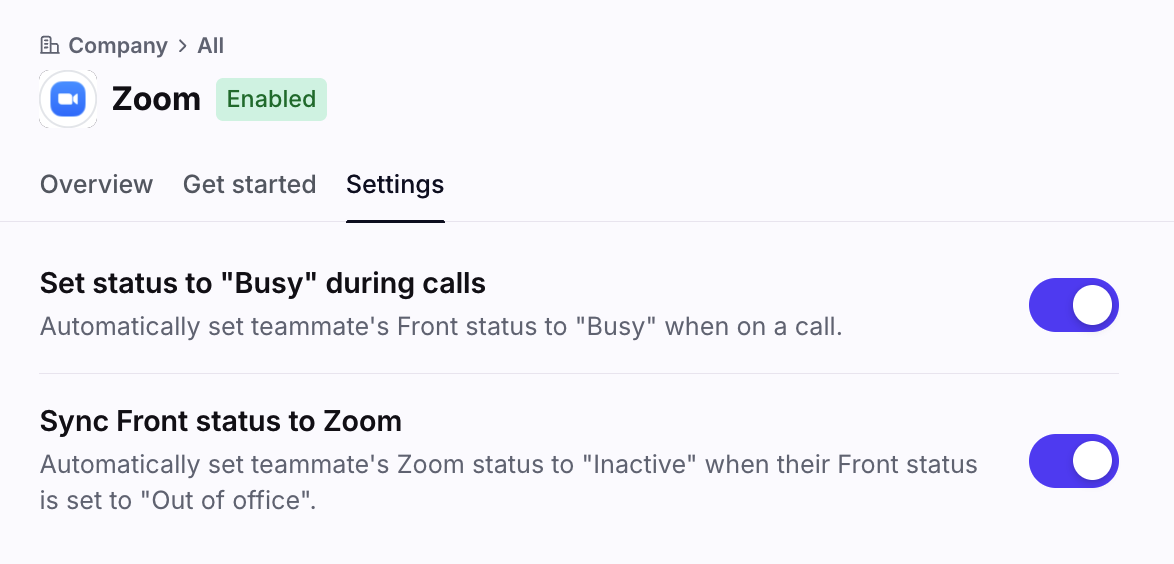 Toggle on if you want to automatically sync Front status changes to Zoom Contact Center. e.g. “Available” in Front to “Ready” in Zoom Contact Center, “Out of office” in Front to “Not Ready” in Zoom Contact Center.