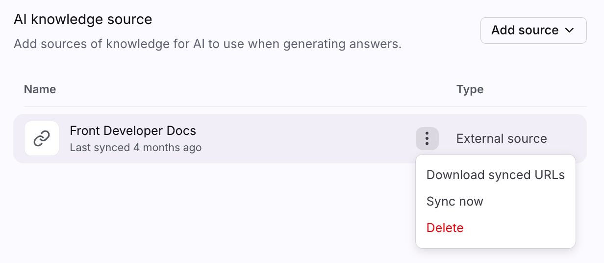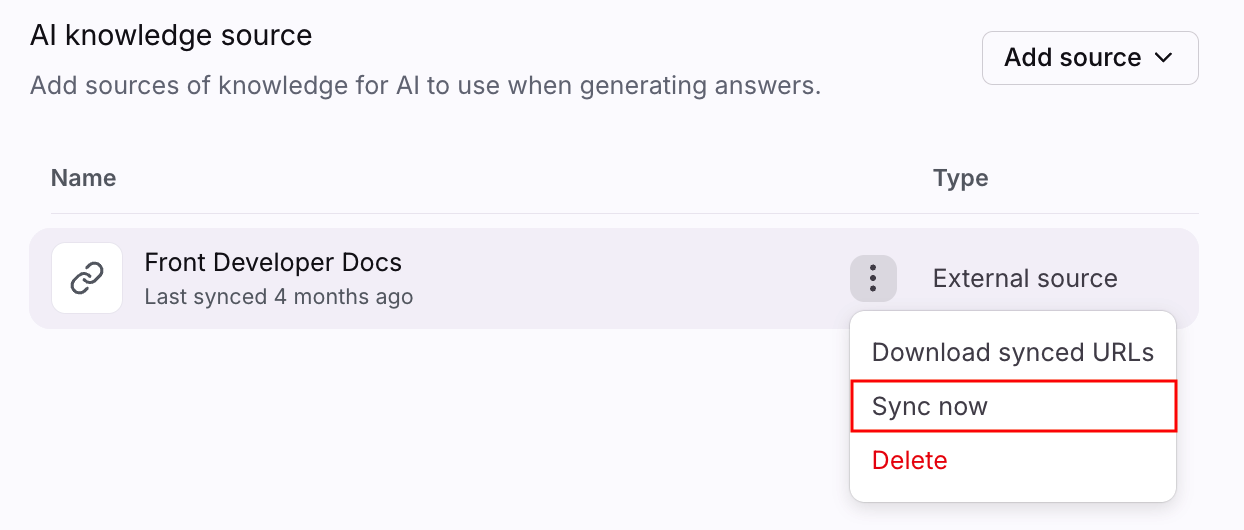 If you need to update your knowledge content, you can return to the AI knowledge source setting and click Sync now to manually trigger a re-sync. This will pull updated content into Front after the initial sync. You can trigger the sync once every 24 hours.