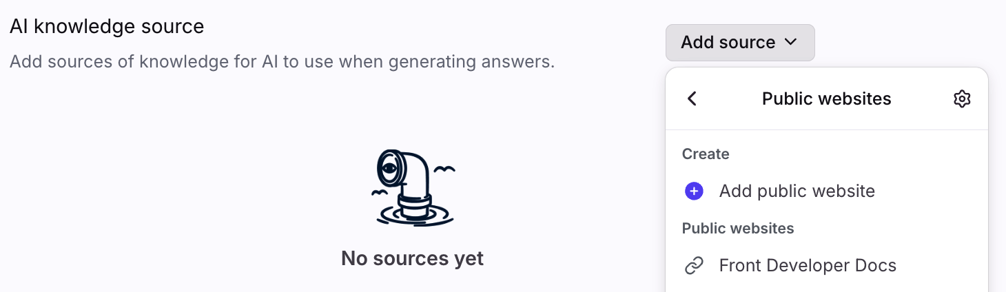 Navigate to the AI knowledge source setting, then use the dropdown menu to choose between a Front knowledge base that you want AI to use to respond to chat inquiries or a third-party knowledge source. You can select up to five sources. See below for guidance on using a third-party knowledge source, then return to this step to continue.