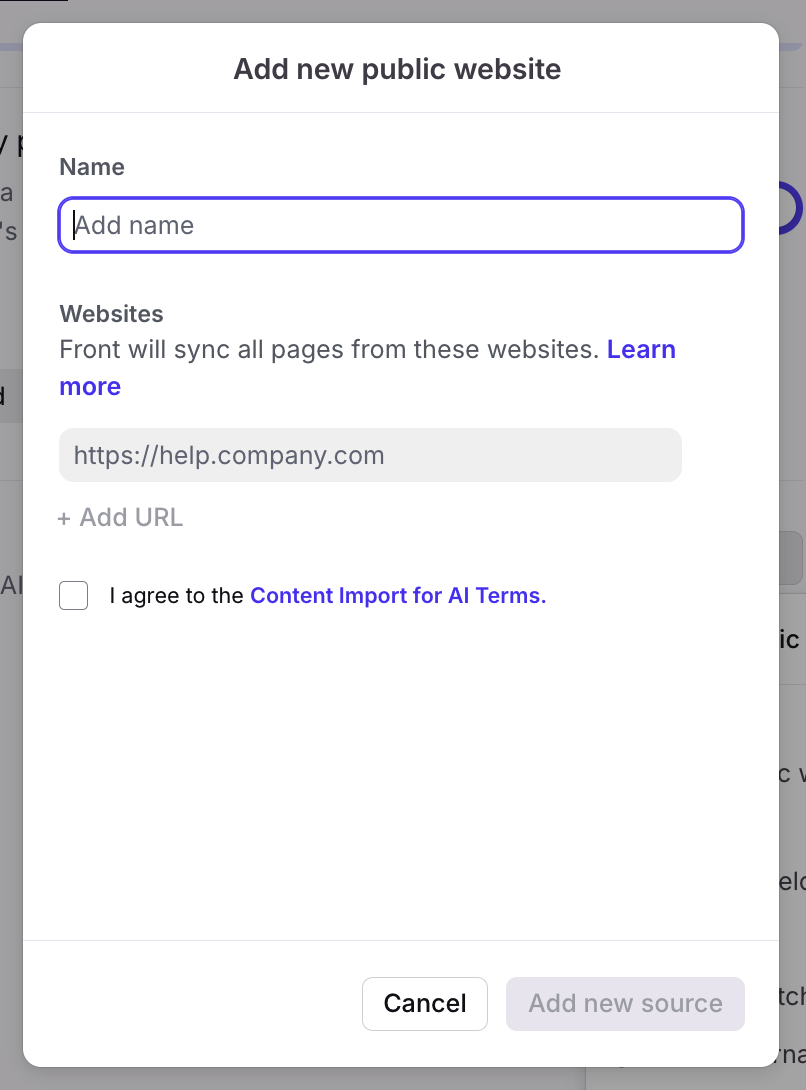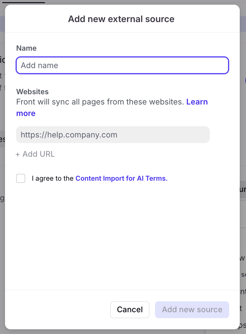 In the pop-up, enter the Name and URL for your external knowledge source. Click Add URL to add multiple URLs under the same domain.