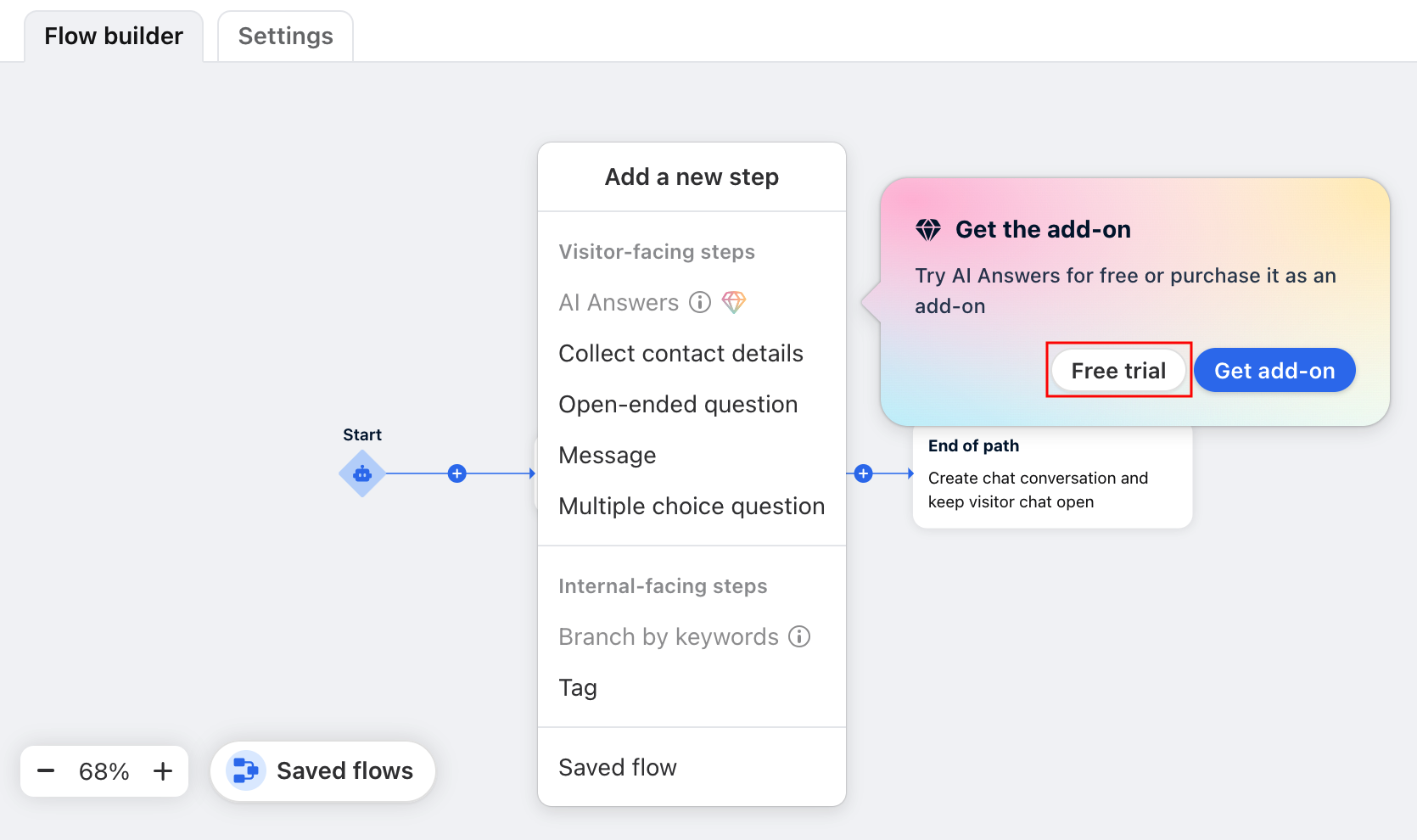 To try AI Answers for free, click the Free trial button when hovering over the AI Answers option in the chatbot flow builder. This will start a 14-day trial with 1000 resolutions.