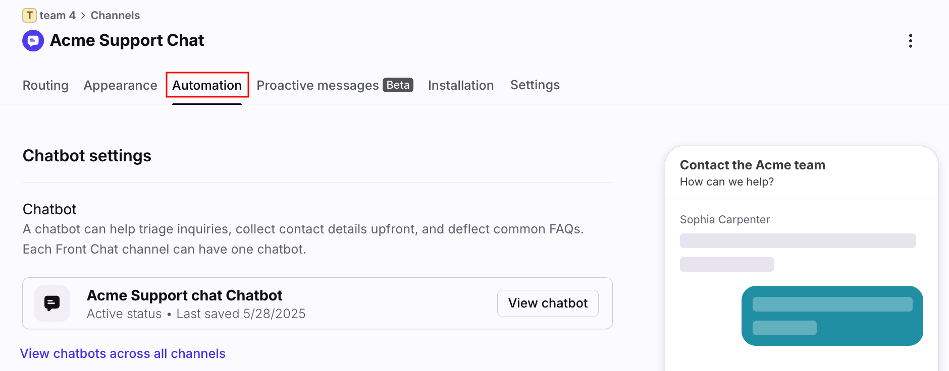 Navigate to your Front Chat channel where you want to set up your external knowledge source, then click the Automation tab at the top.