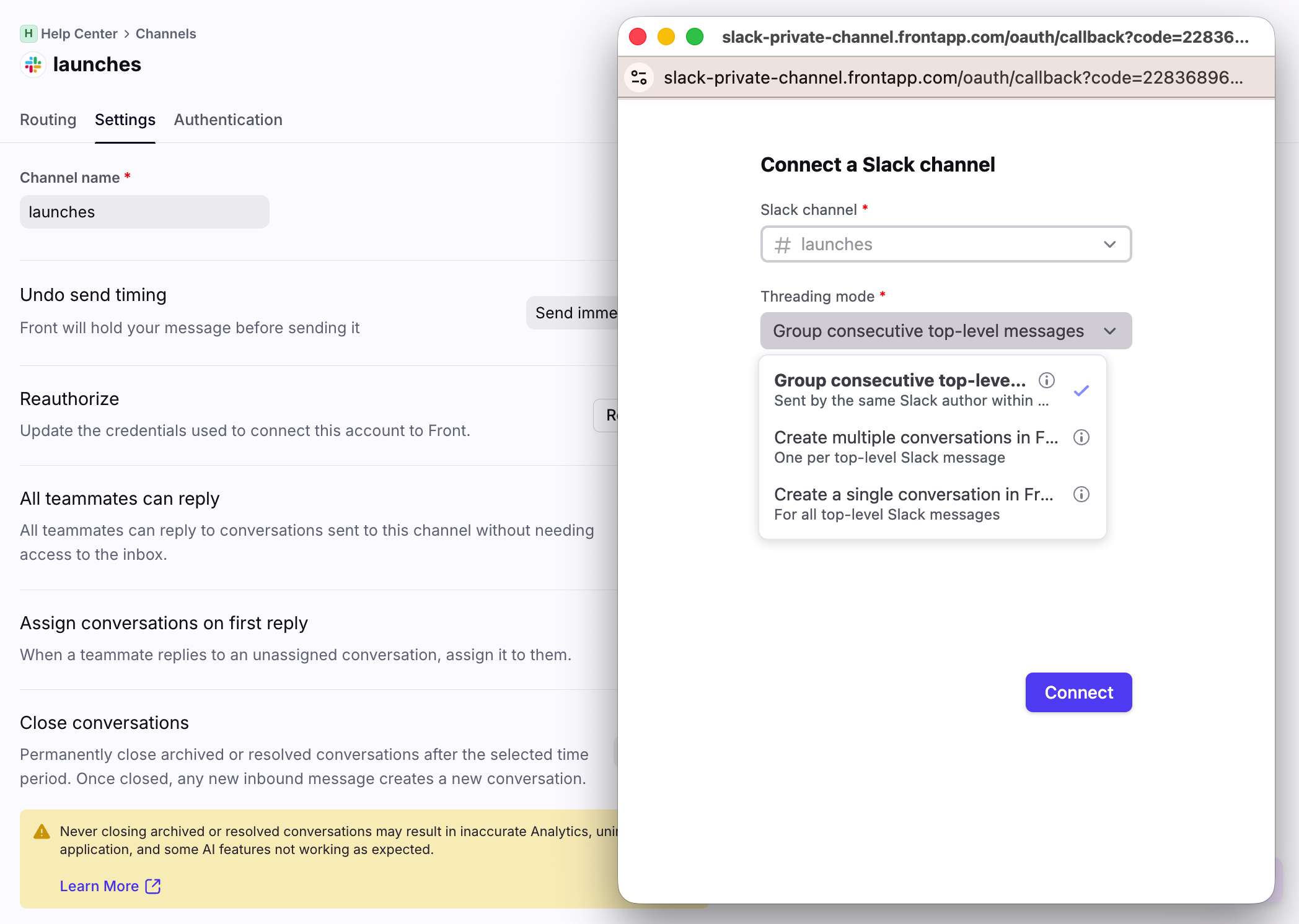 In the Threading mode setting, select how your Slack messages will thread in Front. You can hover over each option to learn more. If you’re bulk connecting Slack channels, the setting will apply to all of them by default, but they can be changed in your channel settings.