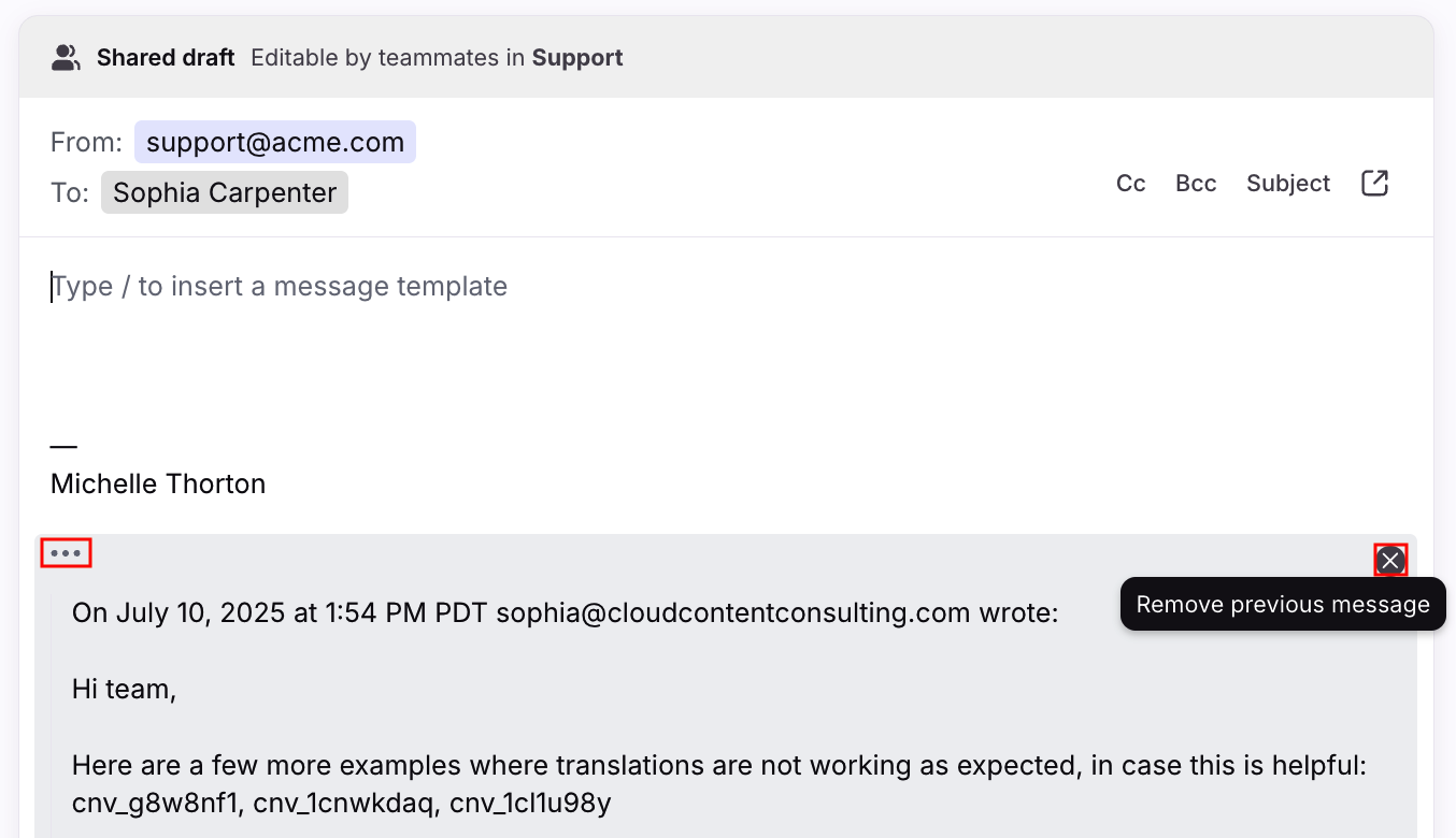 You can remove the previous message content by clicking the three-dot menu below your signature, then the X icon.