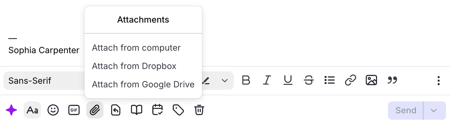 When you're composing an email, select the paperclip to attach from your computer, Dropbox, or Google Drive.