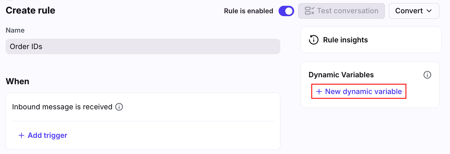 A dynamic variable can reference a previous dynamic variable you built in the rule, useful for advanced use cases. When chaining variables, you can only reference variables created before the variable you're currently editing, and you cannot reorder the variables.