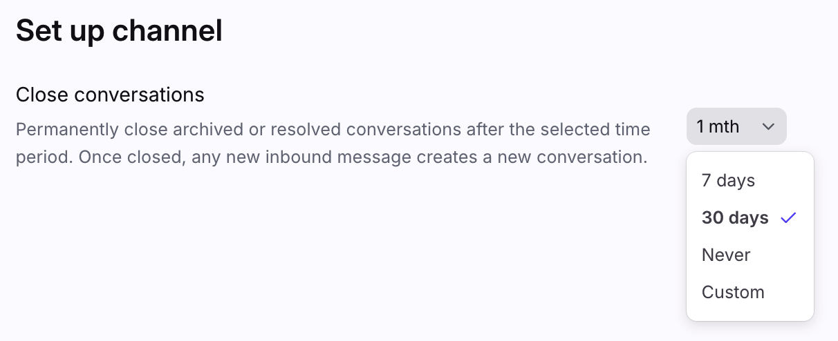 If you plan to use AI features with your inbox, we do not recommend selecting Never. See this article to learn how the Close conversations setting affects AI features.