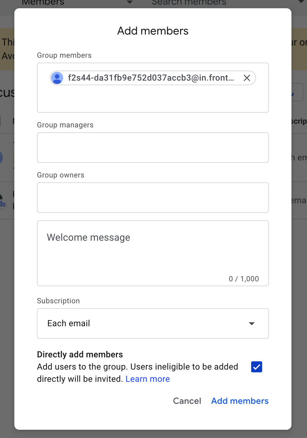 Add the Front forwarding address to the Group members field, then click Add members. This will add the Front forwarding address as a member of your Google Group.