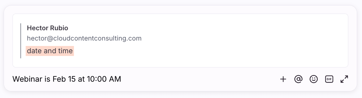 Multiple teammates can highlight and comment on text within the same snippet of a message. The message body will indicate when there are overlapping comments. Click any highlighted segment to preview the associated comment.