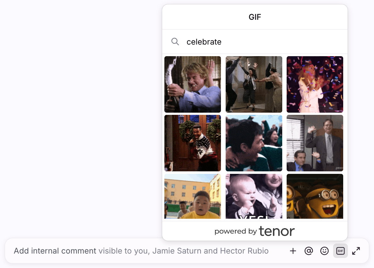 Express yourself fully with the Tenor integration built into the comment bar — simply click the GIF icon and search for the perfect gif to capture your thoughts.