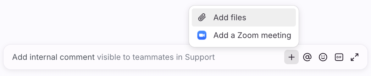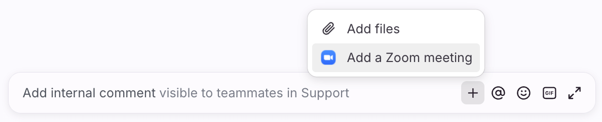 Insert a unique Zoom link directly into a comment by clicking the plus icon (+) in the comment bar and choosing Add a Zoom meeting. This enables instant video or audio collaboration as you are working on a conversation together in Front. See this article to learn more.