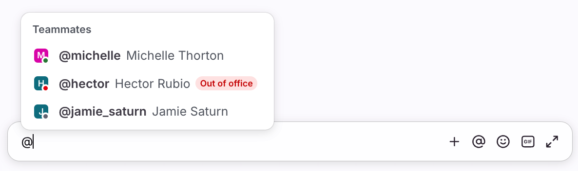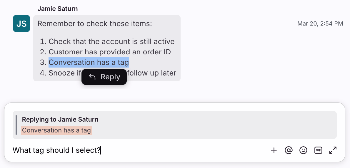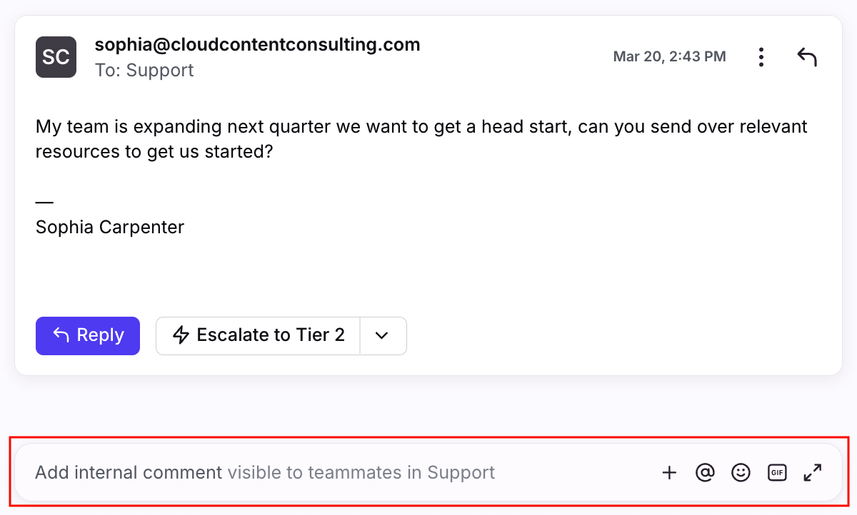 Use comments to collaborate internally with your teammates. Only your team can see posted comments, so you can discuss the conversation amongst yourselves without having to forward the message around. You can also get a specific teammate's attention using @mentions.
