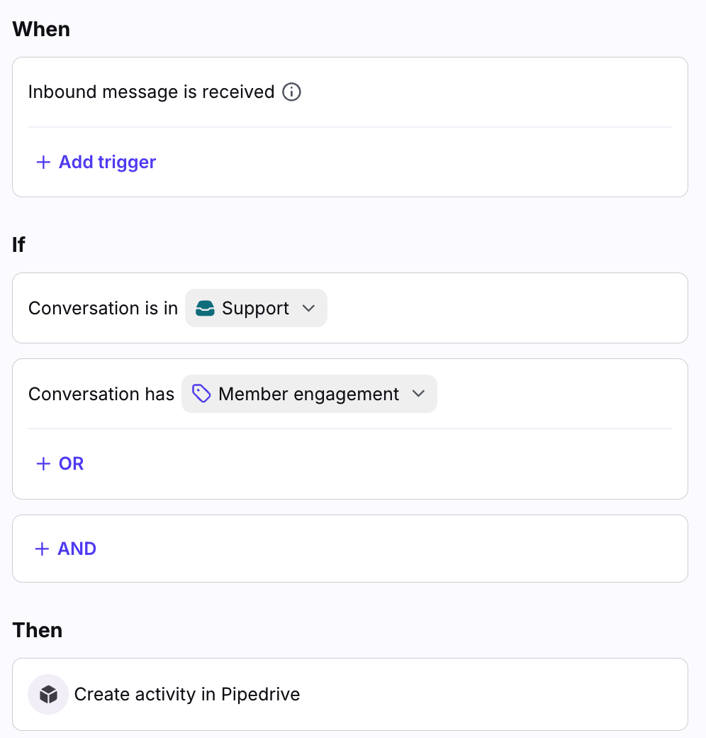 The template will automatically select triggers, conditions, and actions to get you started. You can further customize your rule by selecting specific inboxes, adding additional conditions, and more. Ensure the action Create activity in Pipedrive is included in your rule.