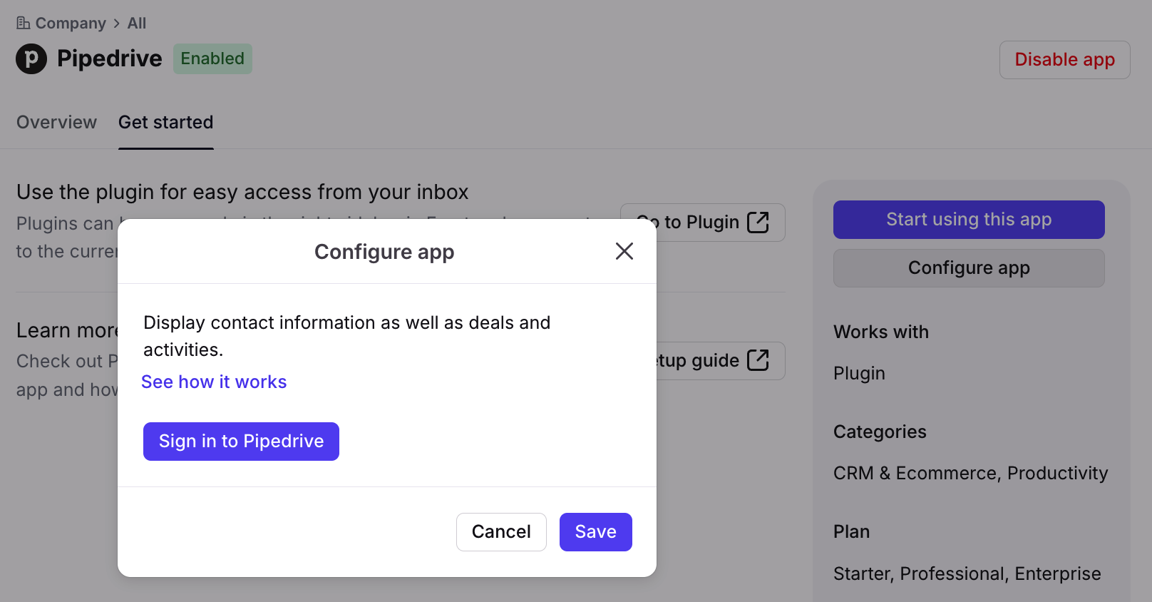Select Pipedrive from the list of integrations. Click See details, then click Enable app to enable the integration.